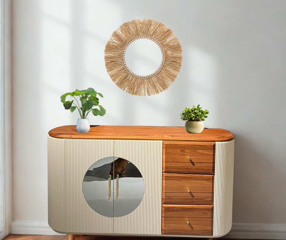 El aparador con puerta circular de cristal es una pieza única que combina elegancia y funcionalidad. Fabricado en madera de pino, destaca por su diseño distintivo y detalles refinados.