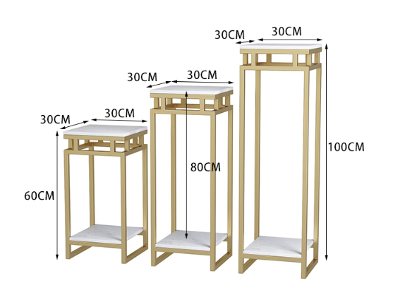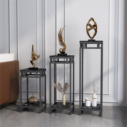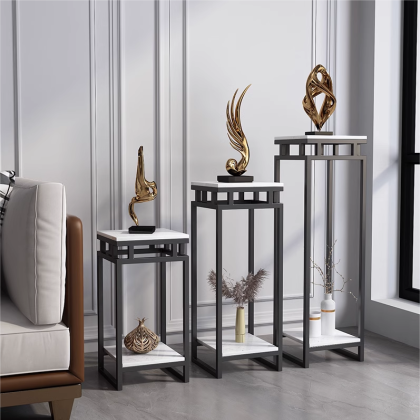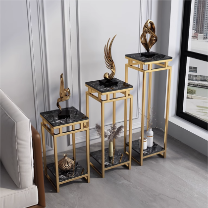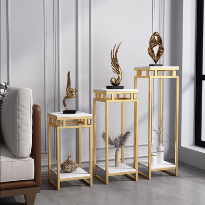 Este conjunto de mesas auxiliares de mármol, soporte de flores de hierro dorado y estante decorativo es versátil y se adapta a una variedad de estilos de decoración, desde lo moderno y contemporáneo hasta lo clásico y tradicional. La elección de adornos y elementos decorativos para colocar en el estante permite a los propietarios personalizar el espacio de acuerdo a sus gustos y preferencias.