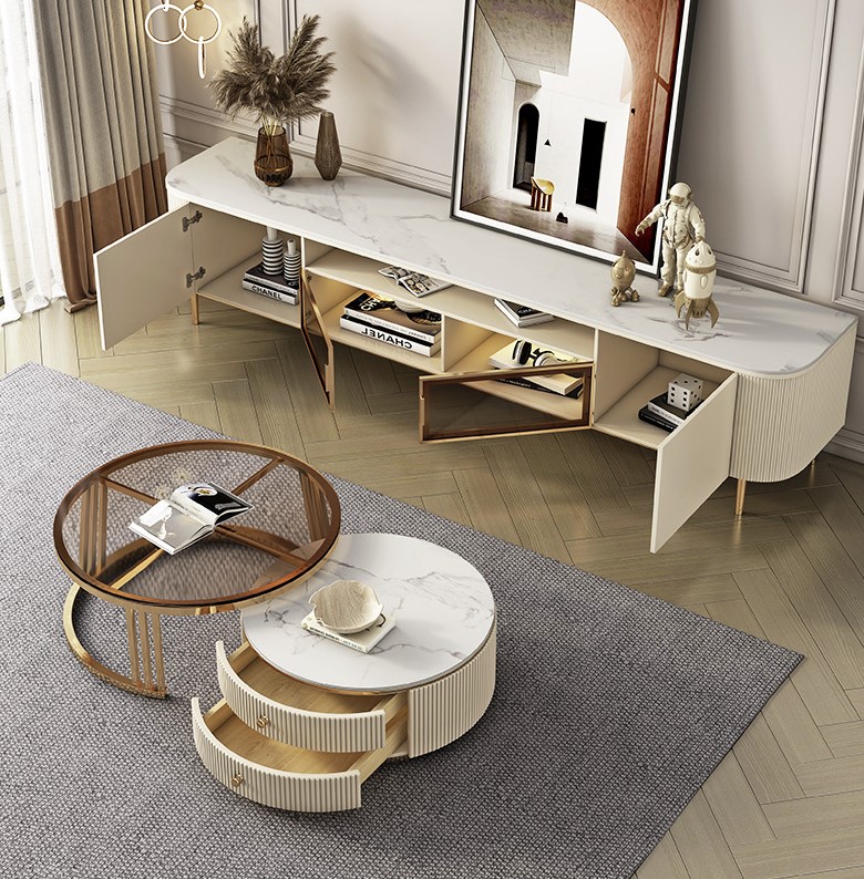 Los acabados de la mesa de centro son meticulosamente seleccionados para realzar su atractivo de lujo. Pueden variar desde maderas nobles de alta calidad, como nogal o caoba, hasta elegantes acabados lacados o dorados. Estos acabados aportan una sensación de opulencia y hacen que la mesa sea el centro de atención en la sala de estar.