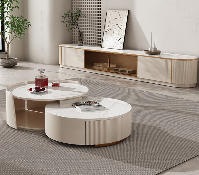 Mesa de centro redonda con cubierta de piedra color blanco, es una obra maestra de diseño que aporta elegancia y estilo a cualquier espacio. Su forma redonda es armoniosa y versátil, lo que la hace perfecta para una variedad de configuraciones y estilos decorativos.