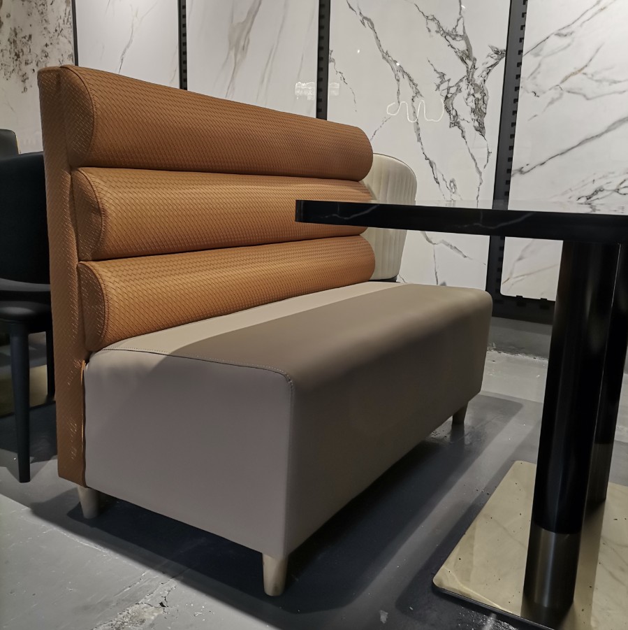 La piel sintética utilizada es ignífuga, impermeable y de fácil limpieza, ideal para cumplir con las exigencias del sector hostelero. El patrón entrelazado no solo añade un valor decorativo y un efecto tridimensional atractivo, sino que también refuerza la durabilidad del tapizado, evitando deformaciones y desgastes prematuros.