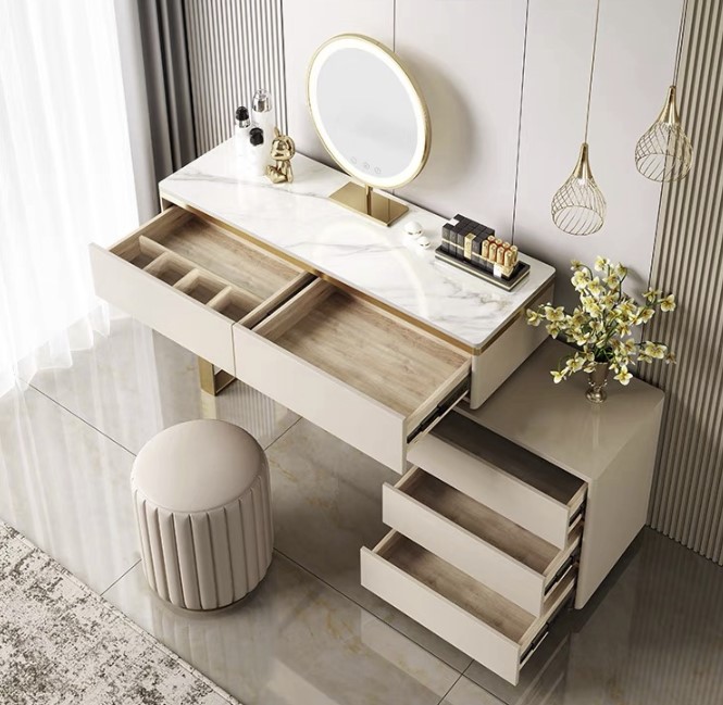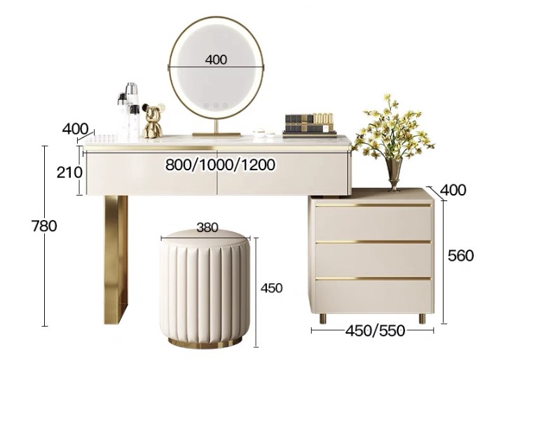 Elegante tocador de maquillaje moderno, diseñado con una cubierta de piedra sinterizada de alta calidad que aporta un toque de lujo y durabilidad. Cuenta con un amplio espacio de almacenamiento gracias a sus cajones, perfectos para organizar todos tus cosméticos y accesorios de belleza. El espejo redondo con iluminación LED integrada proporciona una luz suave y uniforme, ideal para una aplicación precisa del maquillaje. El tapizado en polipiel del taburete aporta un toque de sofisticación y es fácil de limpiar. Este conjunto es la combinación perfecta de funcionalidad y estilo, convirtiendo tu rutina de belleza en una experiencia verdaderamente placentera. Puedes ver las medidas en las imágenes.